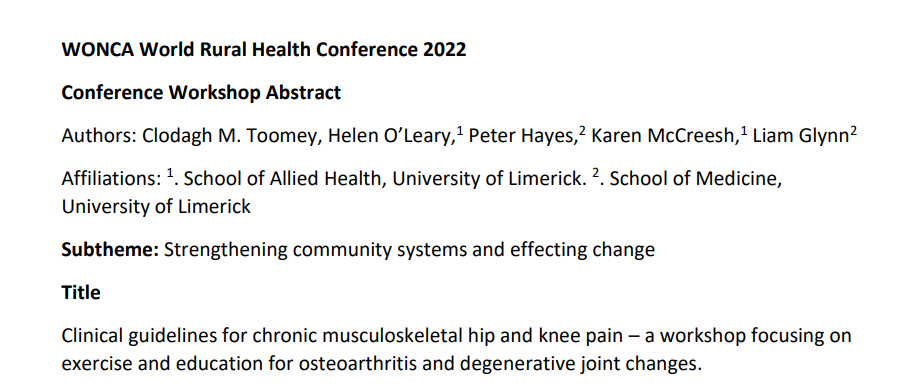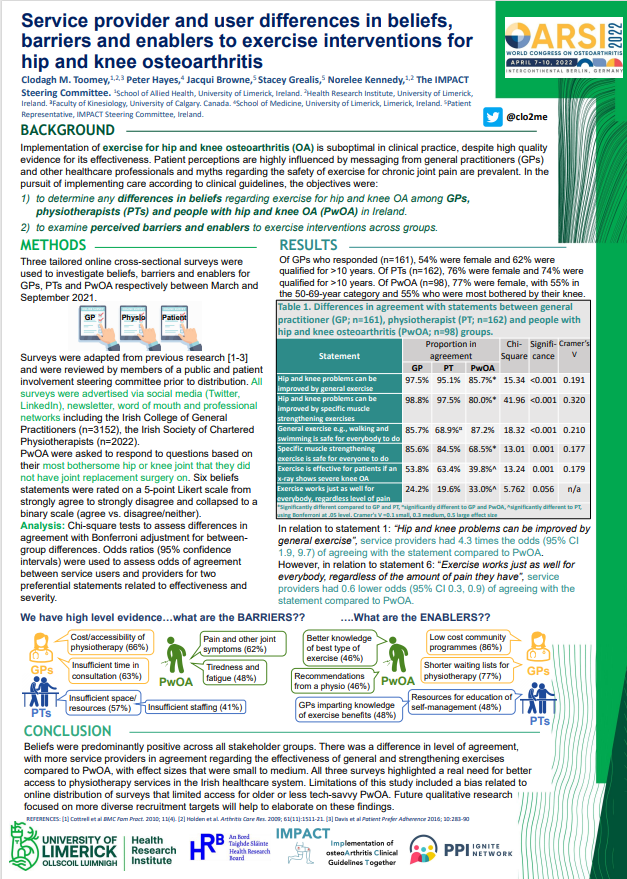Reference: Toomey, C.M., Bhardwaj, A., Browne, J., Dowling, I., Grealis, S., Hayes, P., Higgins, N., Maguire, D., O’Hora, J., Rector, J. and Wood-Thornsbury, A., (2024). Guideline-based exercise management for hip and knee osteoarthritis: a cross-sectional comparison of healthcare professional and patient beliefs in Ireland. BMJ open, 14(7), p.e080646. https://doi.org/10.1007/s00296-024-05590-9