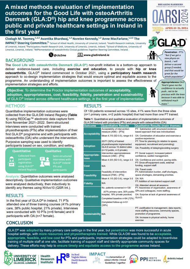 OARSI Conference 2024, Evaluation of implementation outcomes for GLA:D after the first year. To see more, click here
