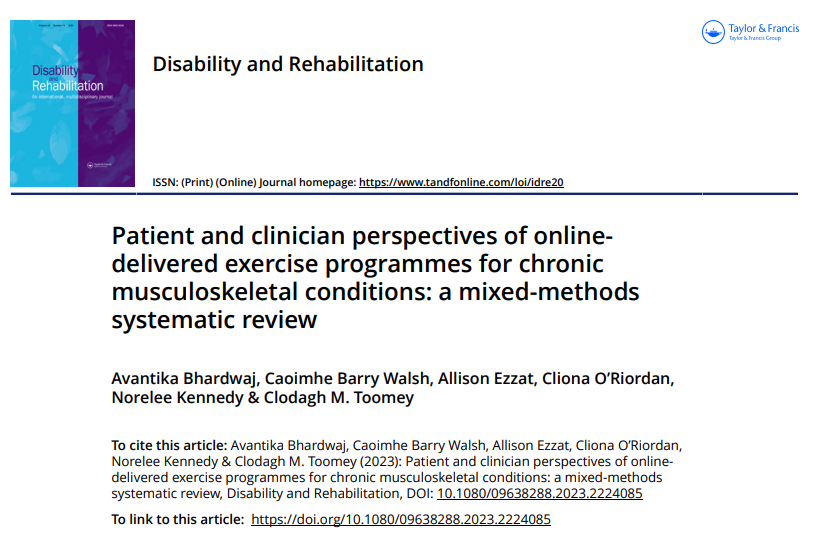 Bhardwaj, A., Barry Walsh, C., Ezzat, A., O’Riordan, C., Kennedy, N. and Toomey, C.M., (2024). Patient and clinician perspectives of online-delivered exercise programmes for chronic musculoskeletal conditions: a mixed-methods systematic review. Disability and Rehabilitation, 46(11), pp.2196-2212. https://doi.org/10.1007/s00296-024-05590-9