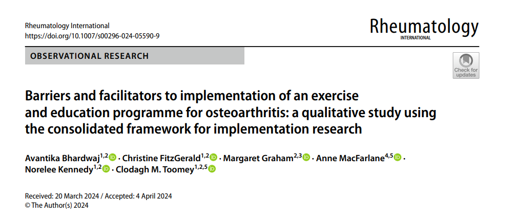 Bhardwaj, A., FitzGerald, C., Graham, M., MacFarlane, A., Kennedy, N., Toomey, CM. (2024) Barriers and facilitators to implementation of an exercise and education programme for osteoarthritis: a qualitative study using the consolidated framework for implementation research. Rheumatology International 44, 1035-1050. https://doi.org/10.1007/s00296-024-05590-9
