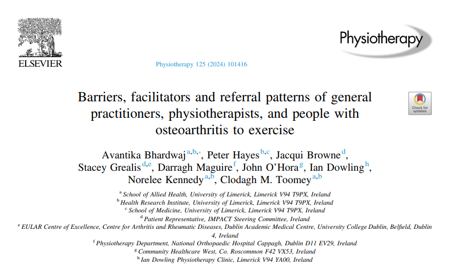 Bhardwaj, A., Hayes, P., Browne, J., Grealis, S., Maguire, D., O’Hora, J., Dowling, I., Kennedy, N. and Toomey, C.M., (2024). Barriers, facilitators and referral patterns of general practitioners, physiotherapists, and people with osteoarthritis to exercise. Physiotherapy, 125, p.101416. https://doi.org/10.1016/j.physio.2024.101416