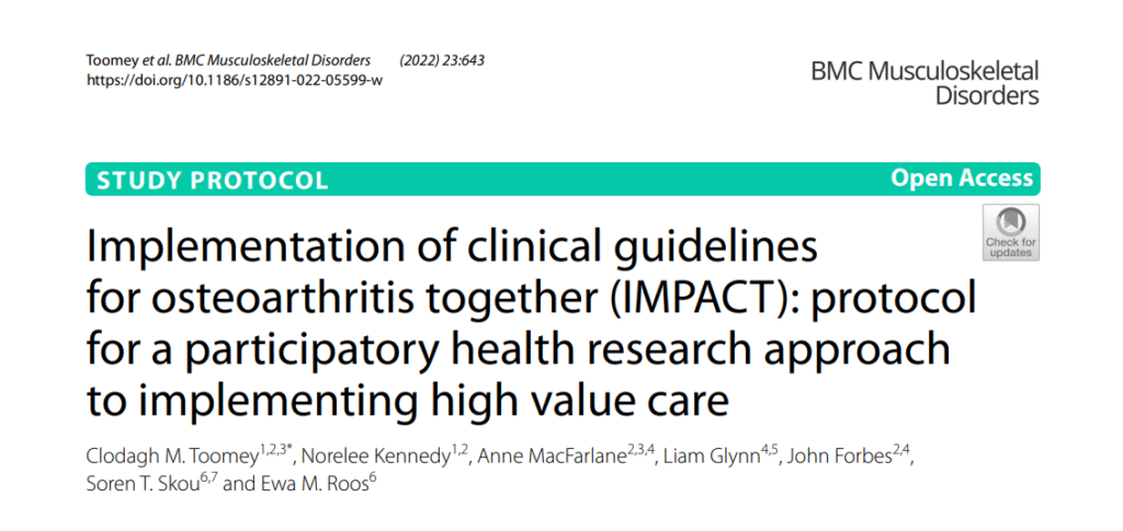 Toomey, C.M., Kennedy, N., MacFarlane, A., Glynn, L., Forbes, J., Skou, S.T. and Roos, E.M., (2022). Implementation of clinical guidelines for osteoarthritis together (IMPACT): protocol for a participatory health research approach to implementing high value care. BMC musculoskeletal disorders, 23(1), p.643. https://doi.org/10.1007/s00296-024-05590-9