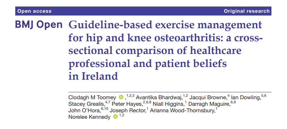 Toomey, C.M., Bhardwaj, A., Browne, J., Dowling, I., Grealis, S., Hayes, P., Higgins, N., Maguire, D., O’Hora, J., Rector, J. and Wood-Thornsbury, A., (2024). Guideline-based exercise management for hip and knee osteoarthritis: a cross-sectional comparison of healthcare professional and patient beliefs in Ireland. BMJ open, 14(7), p.e080646. https://doi.org/10.1007/s00296-024-05590-9